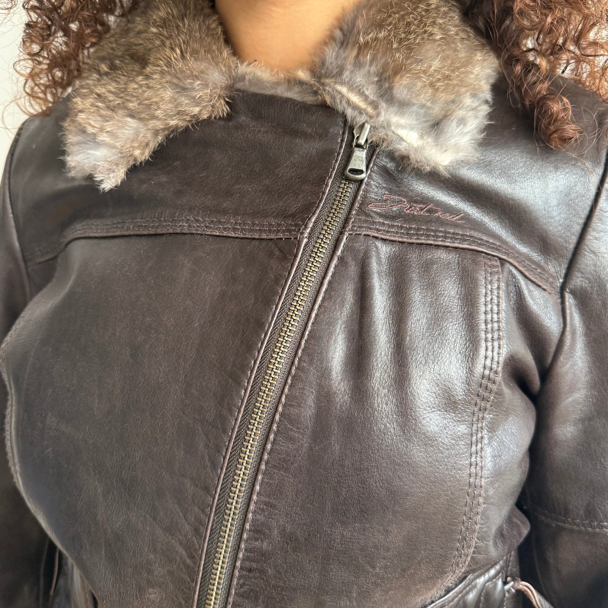 Brown real leather aviator / moto jacket with real fur collar and lapels