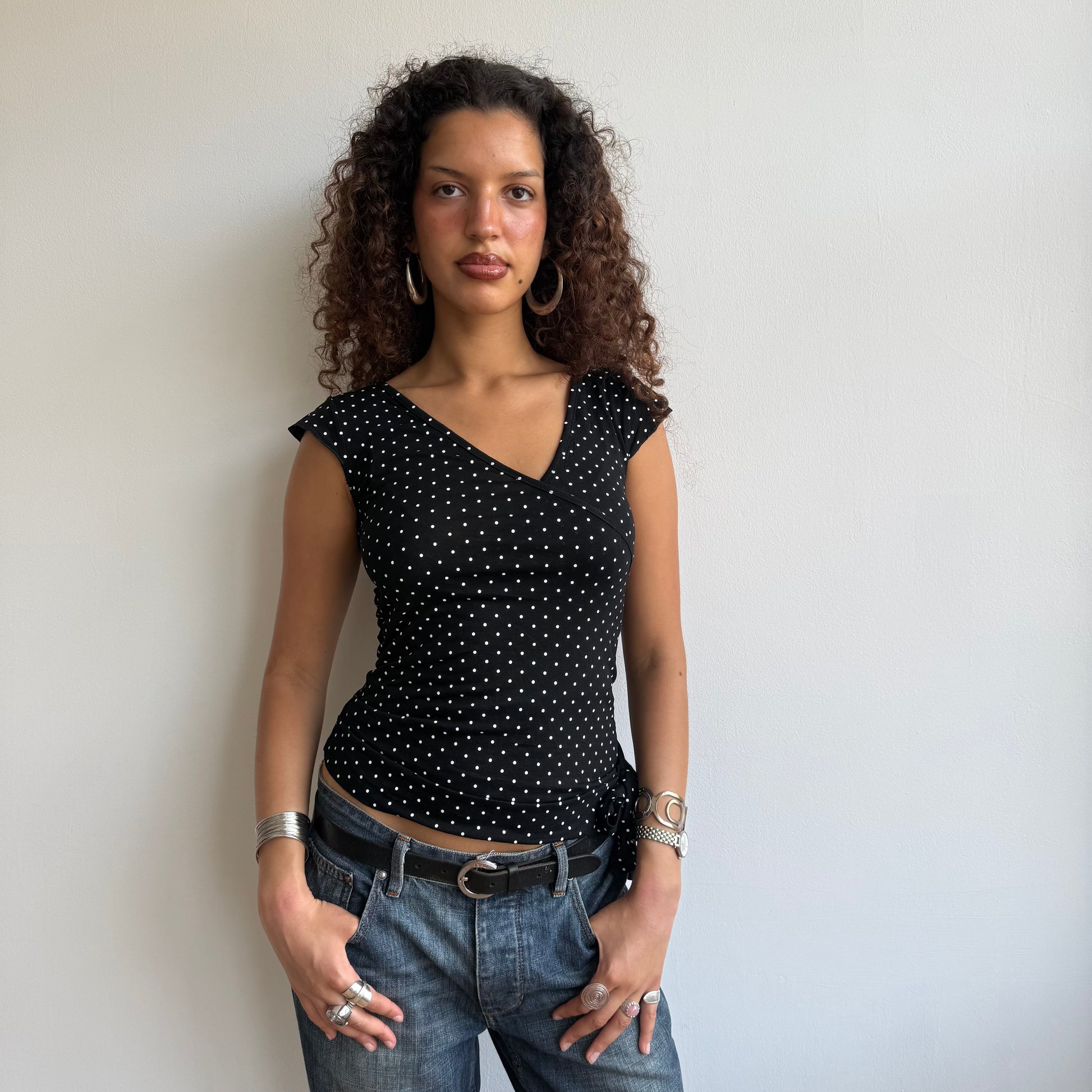 Black and white polka dot wrap top with tie side