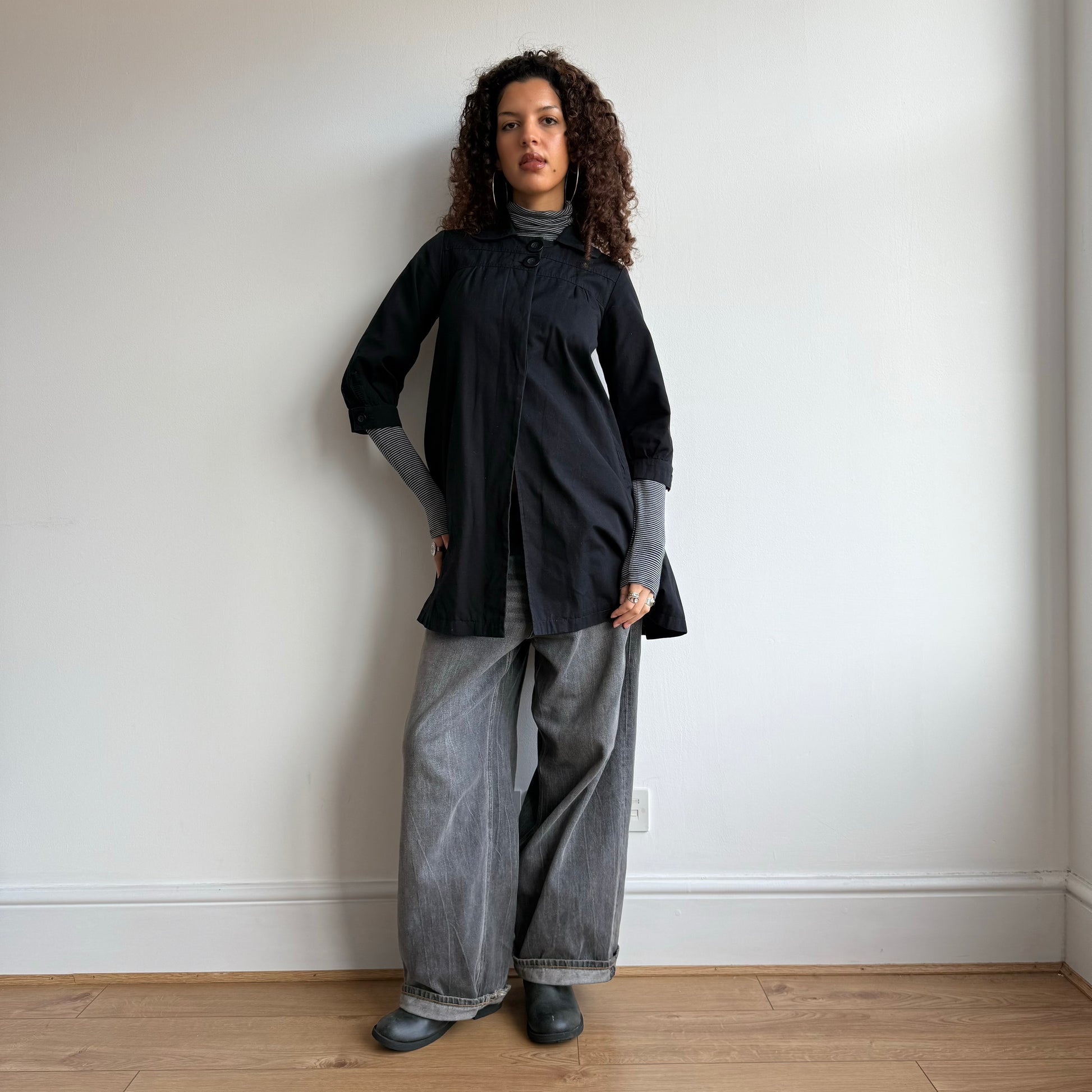 Black mid length peacoat swing coat jacket with two external buttons and two covered ones
