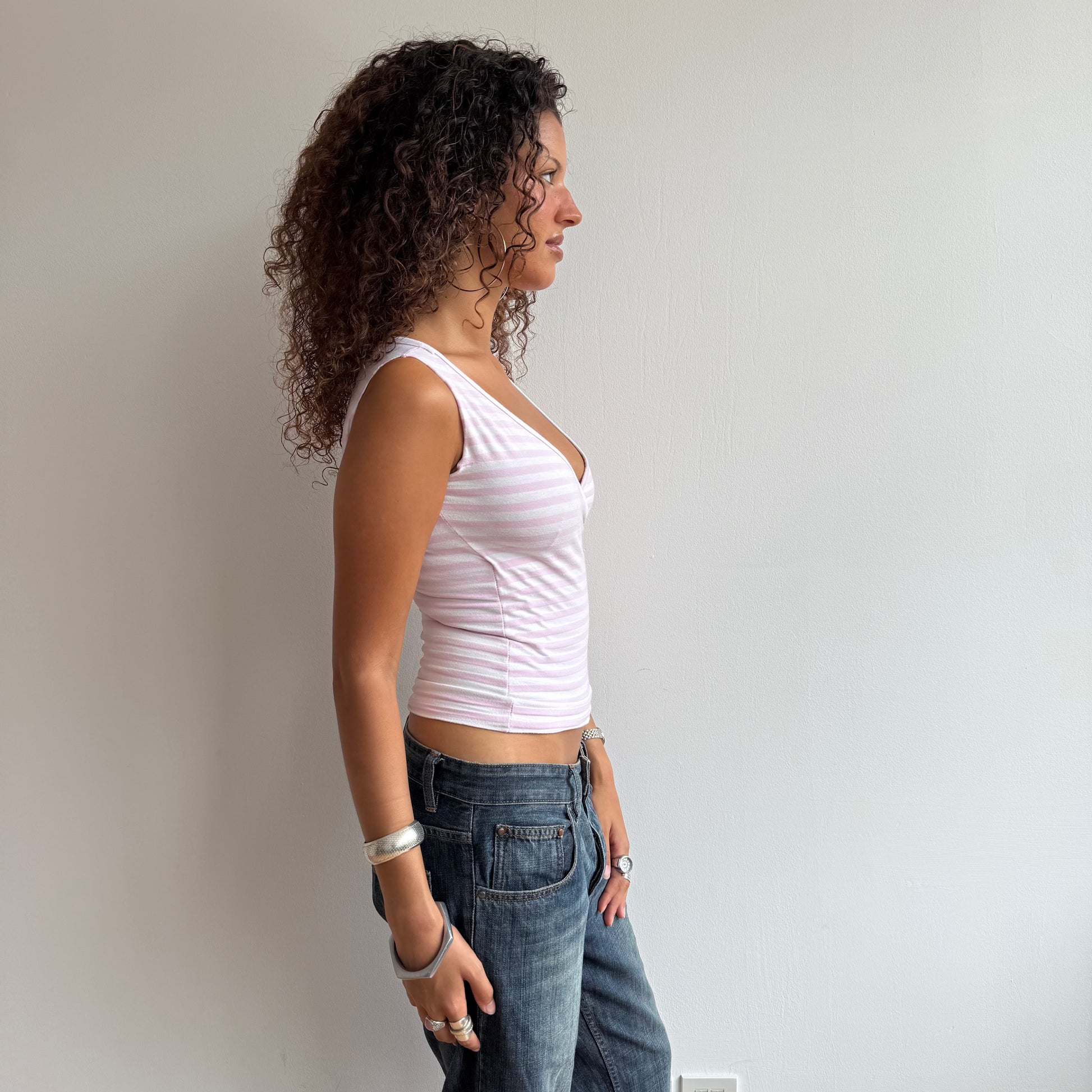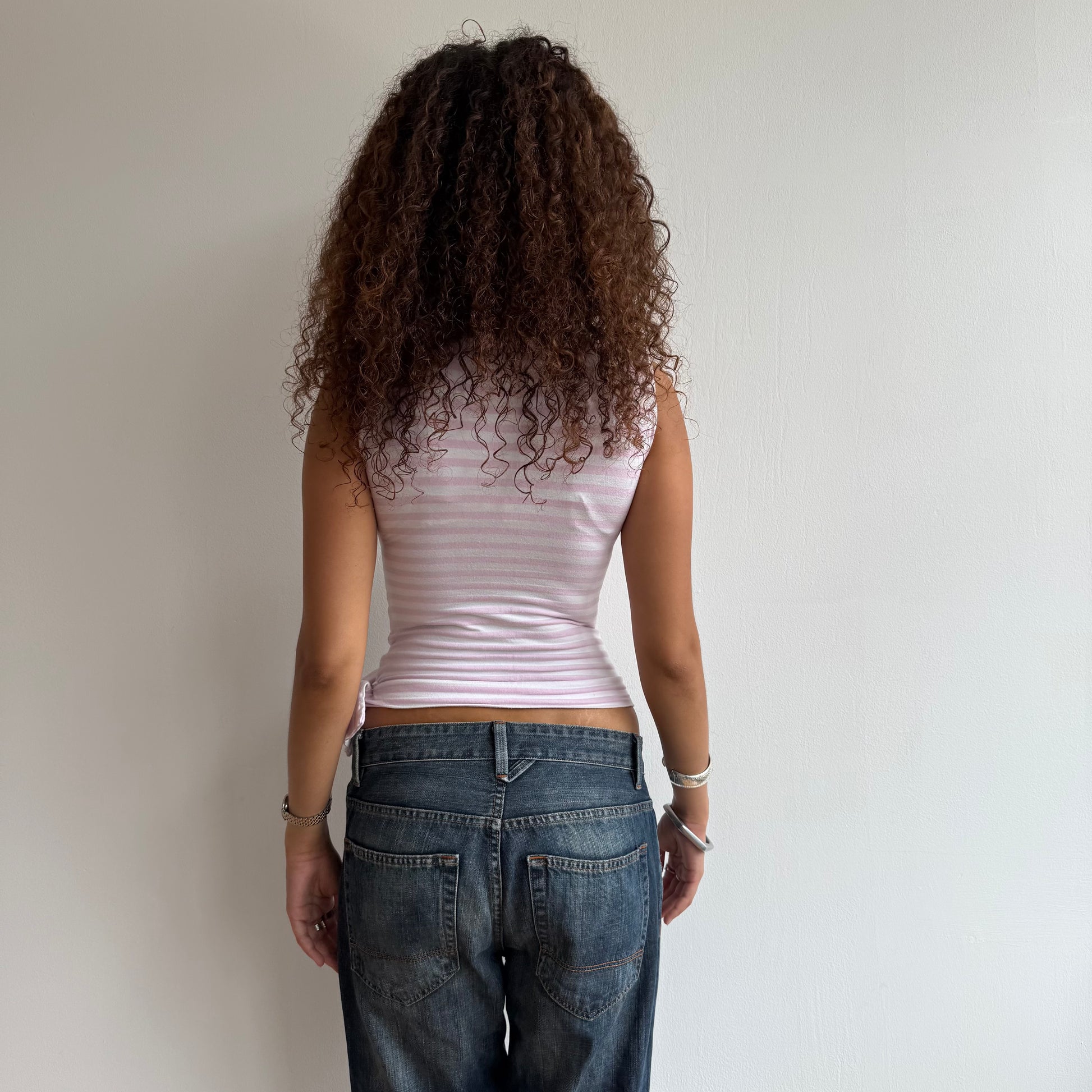 Pink and white wrap front tie waist t shirt with raw hem sleeves