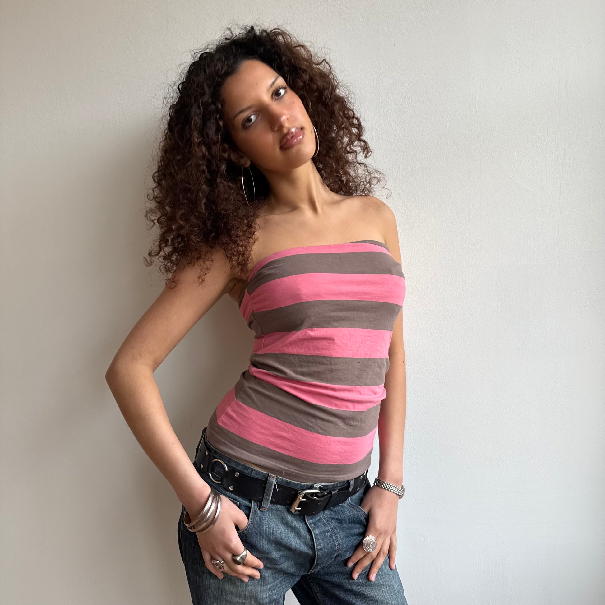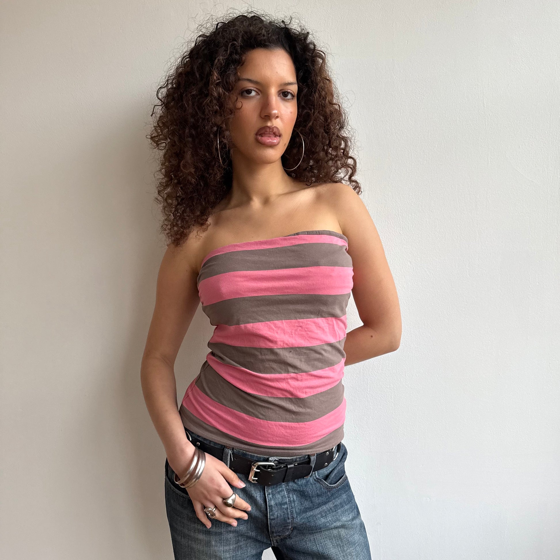 Pink and grey striped bandeau top