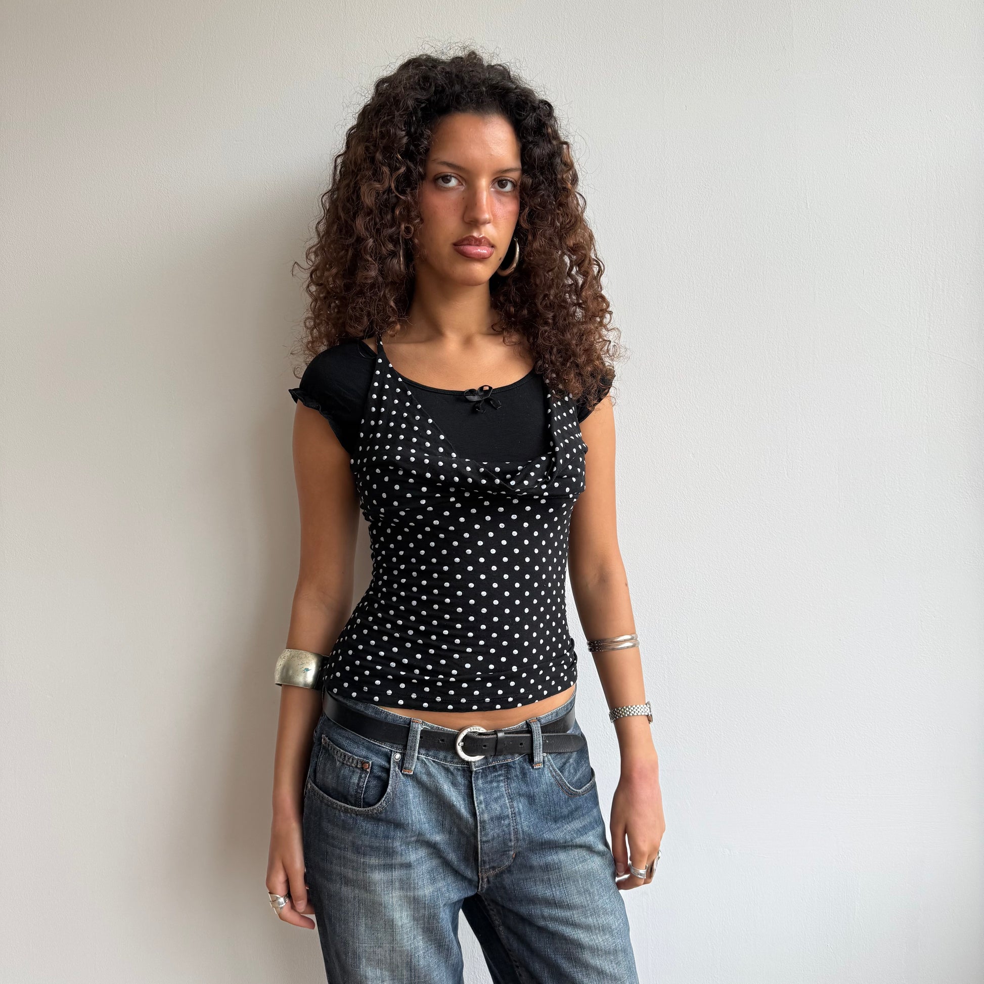 Black and white polka dot top with inbuilt double layer and cross back detailing