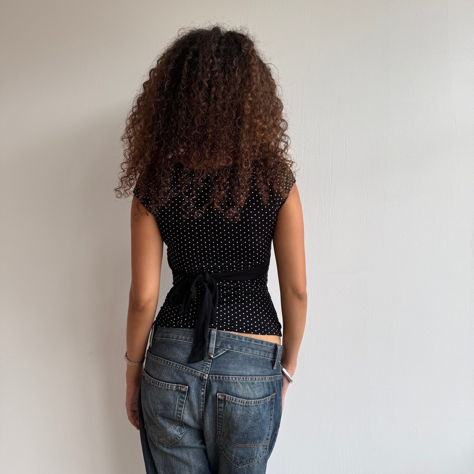 black and white polka dot top with adjustable tie around the back