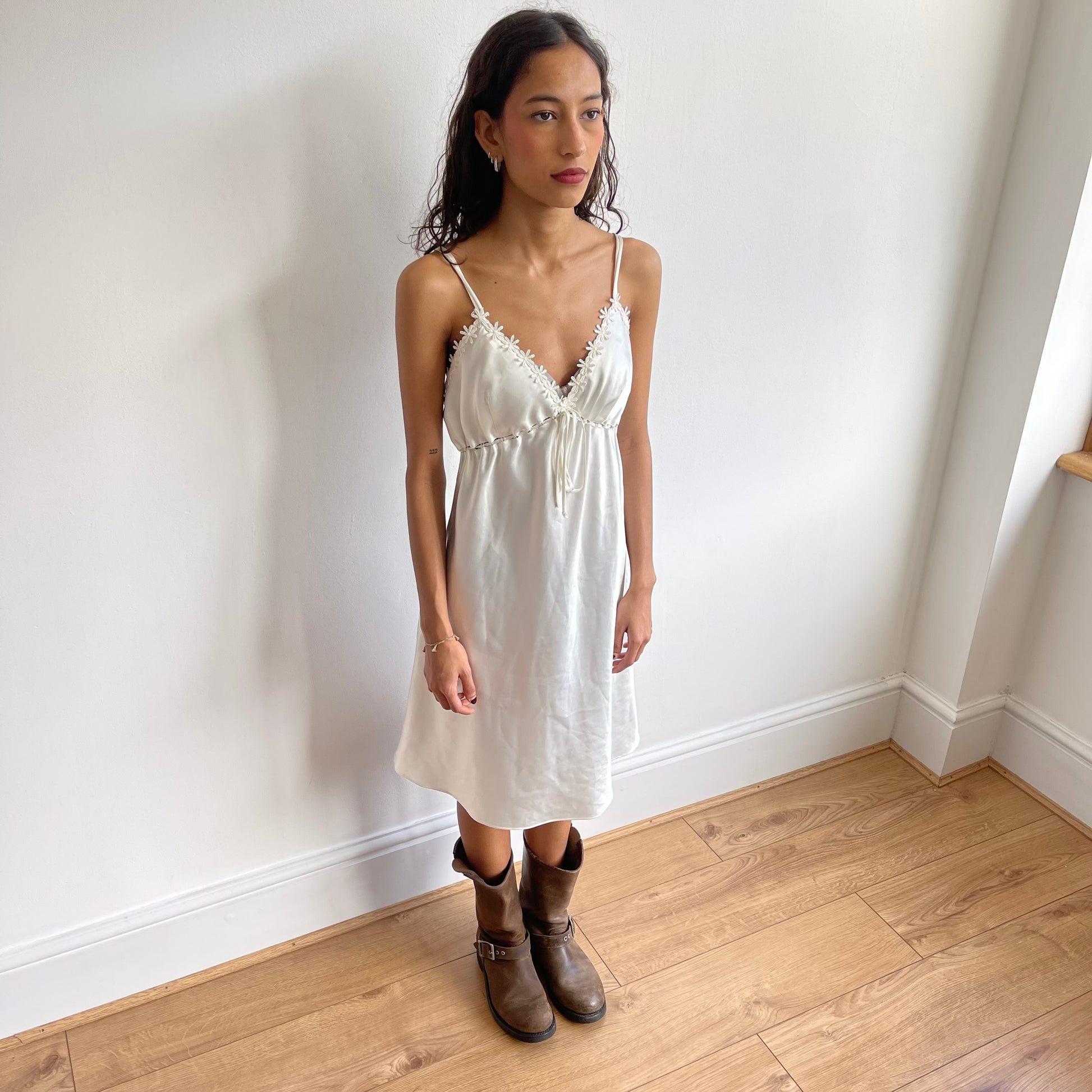 Cream / ivory satin slip dress with floral detailing along the bust and tie detailing