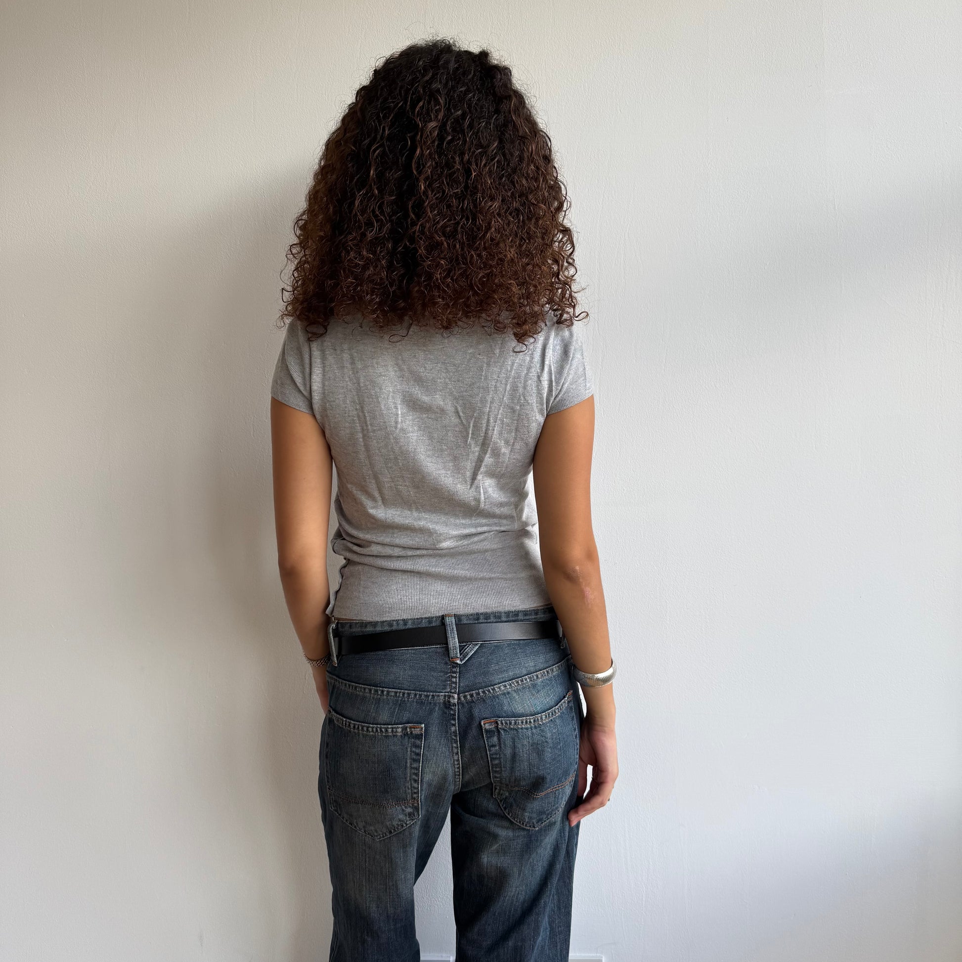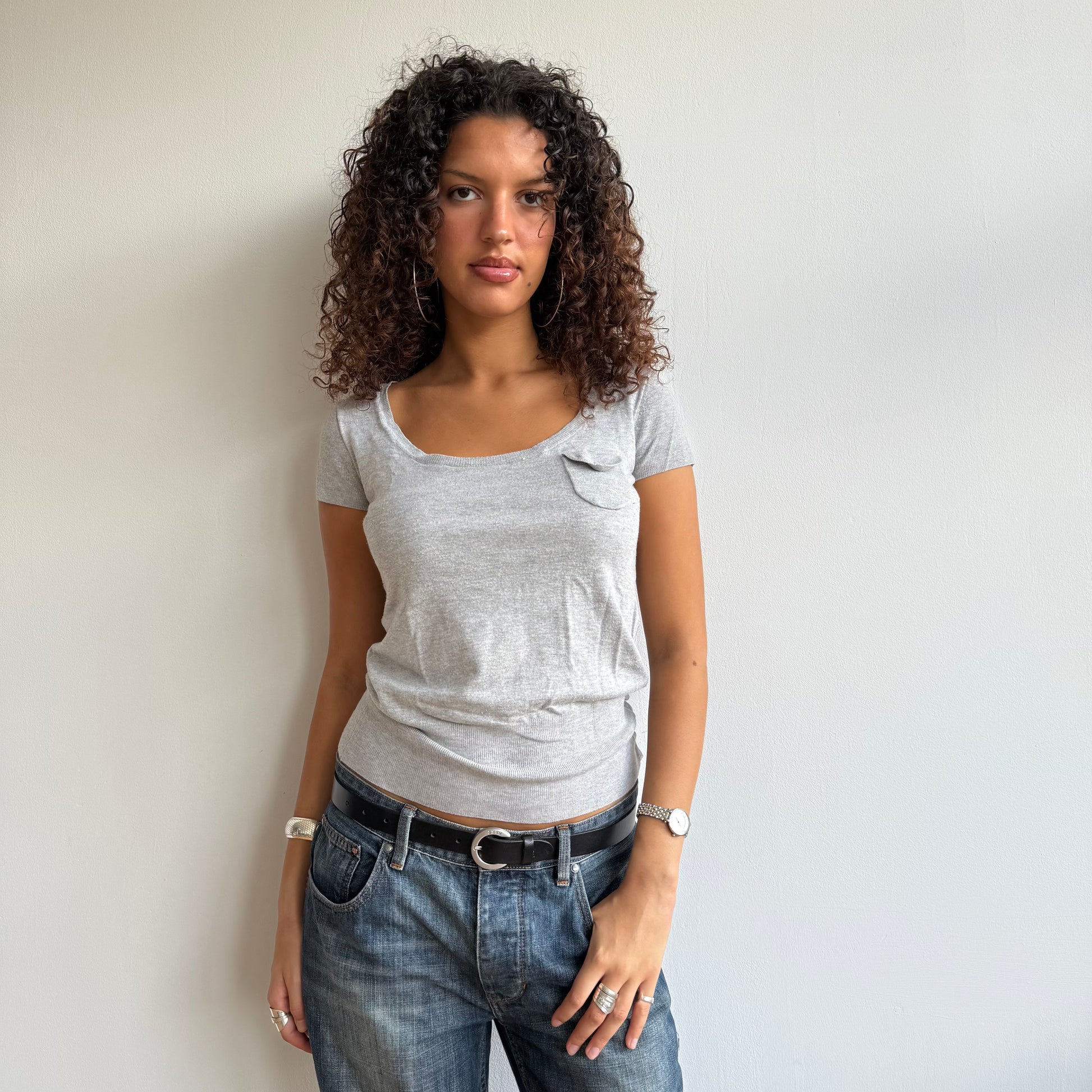Slouchy grey short sleeve knit with pocket and buttons on the waist
