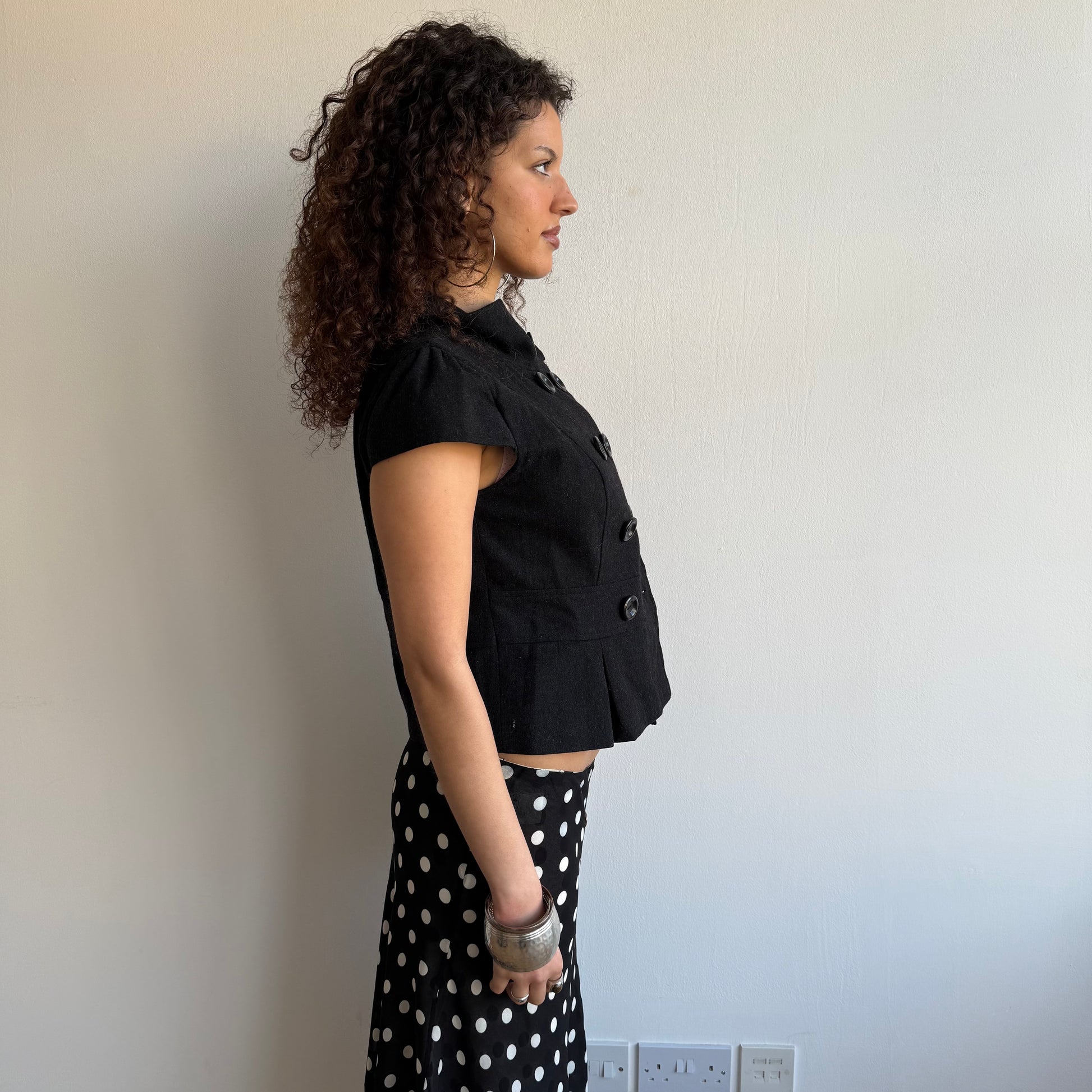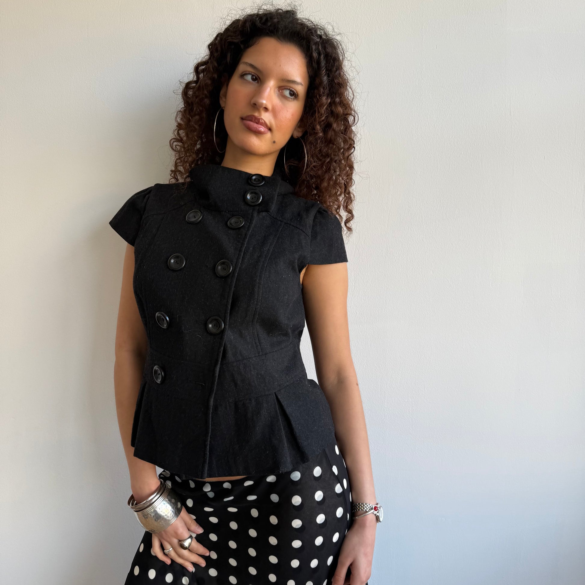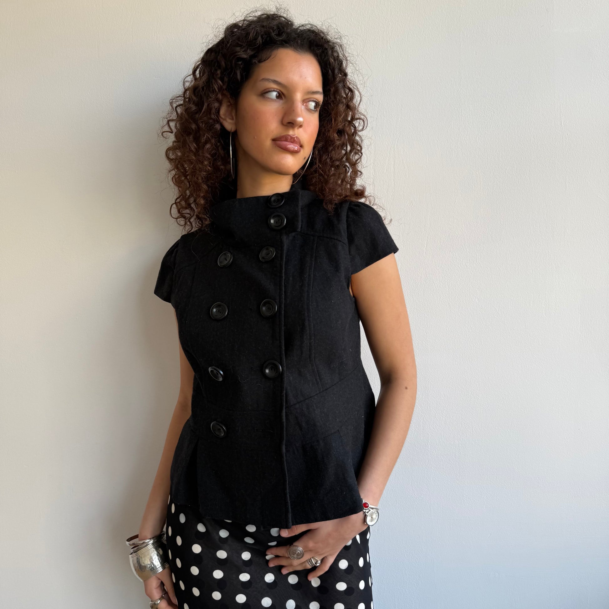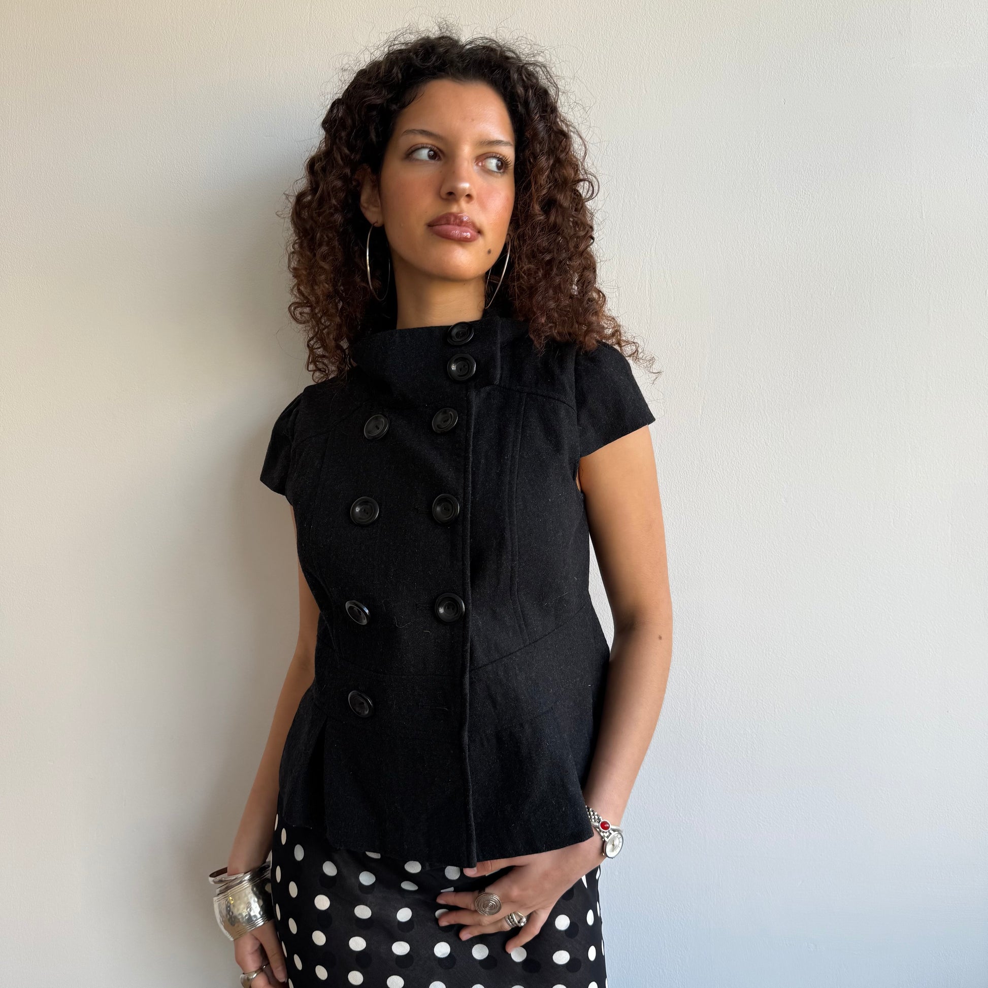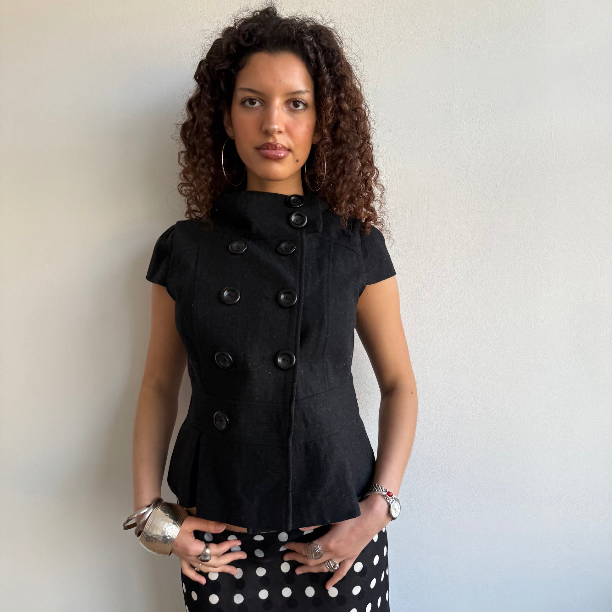 Charcoal grey short sleeve wool peacoat with double breasted buttons (one missing)