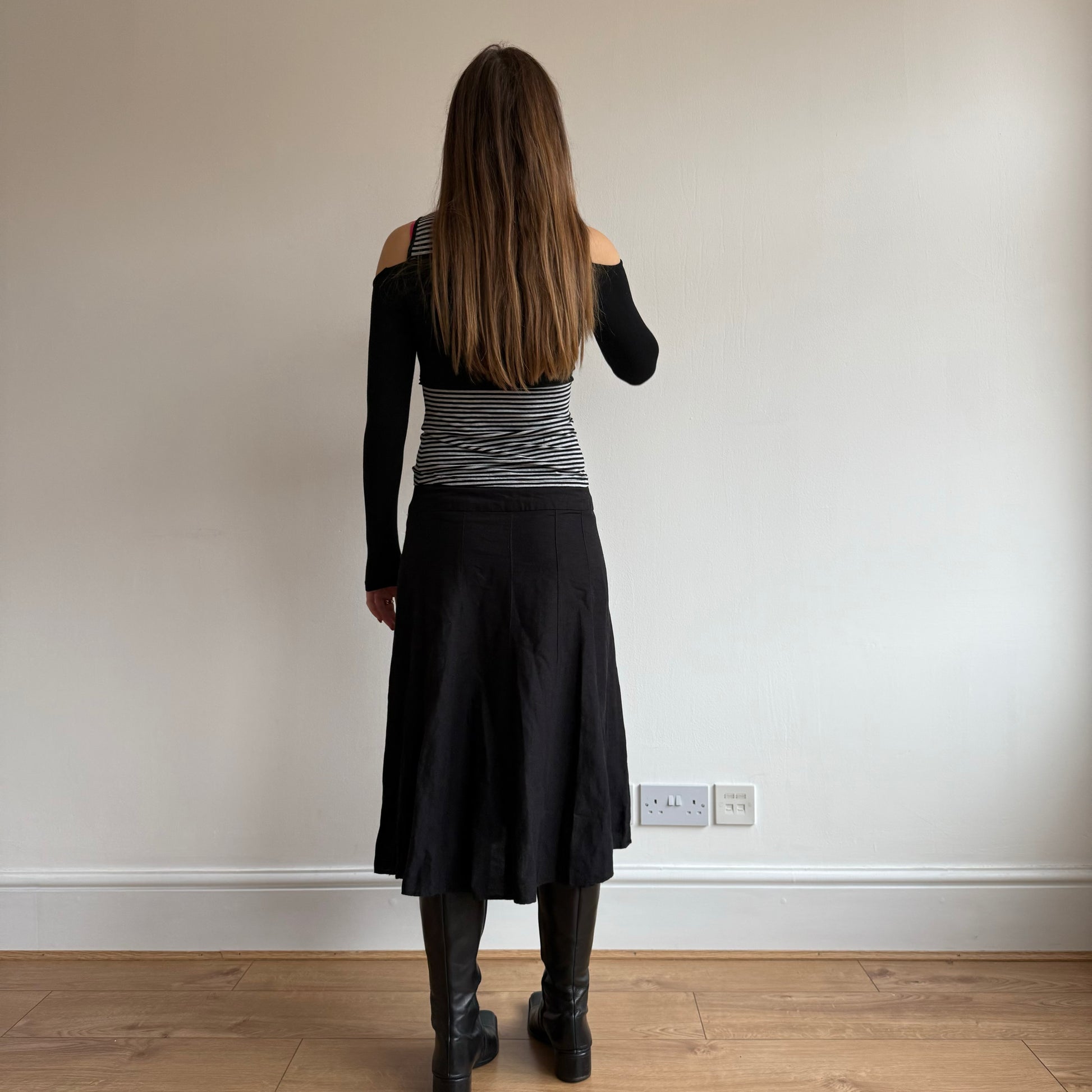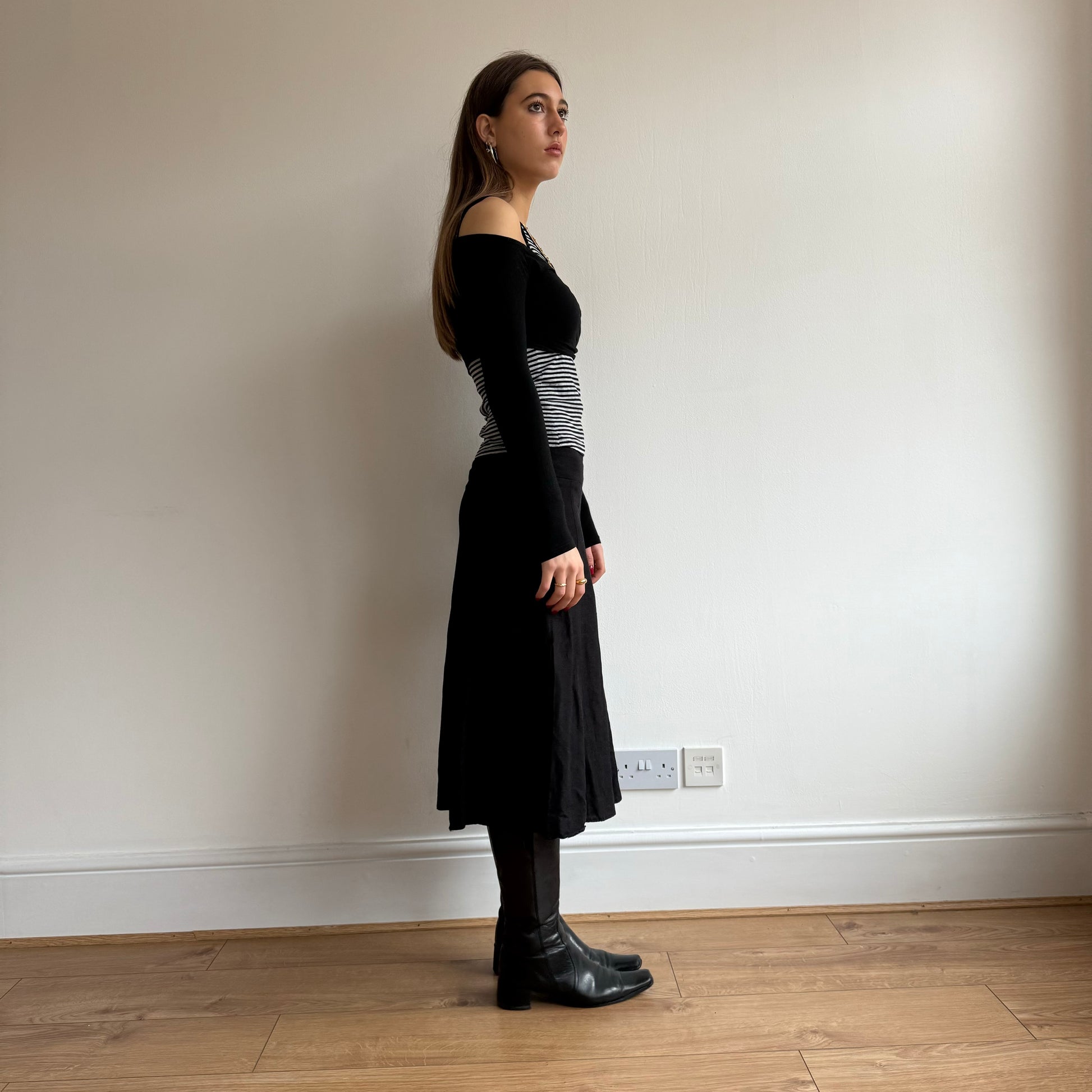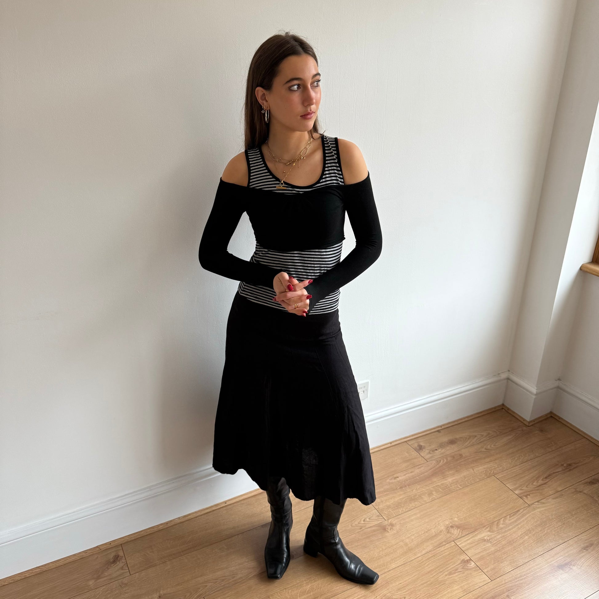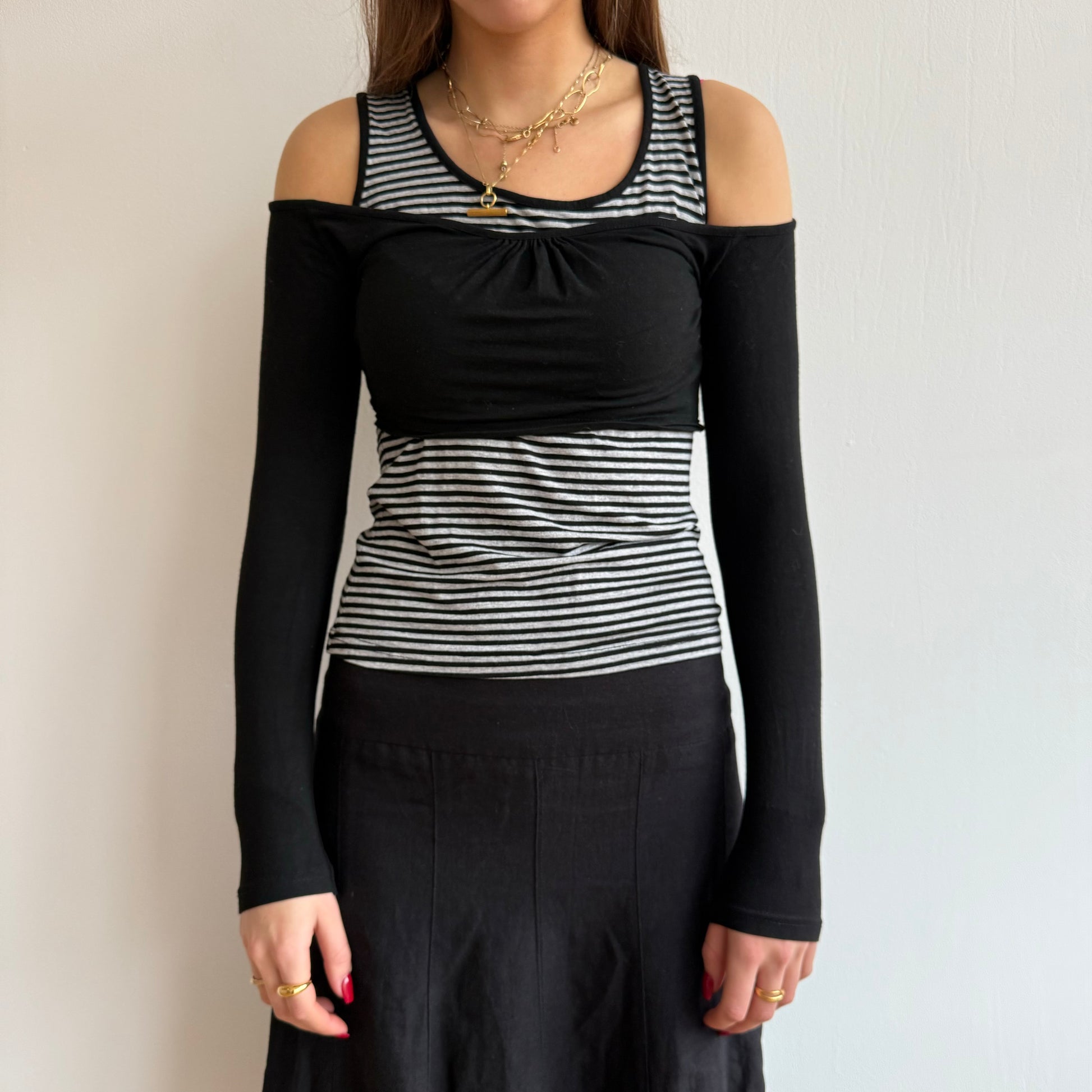 Grey and black striped top with built in black off the shoulder bandeau sleeves