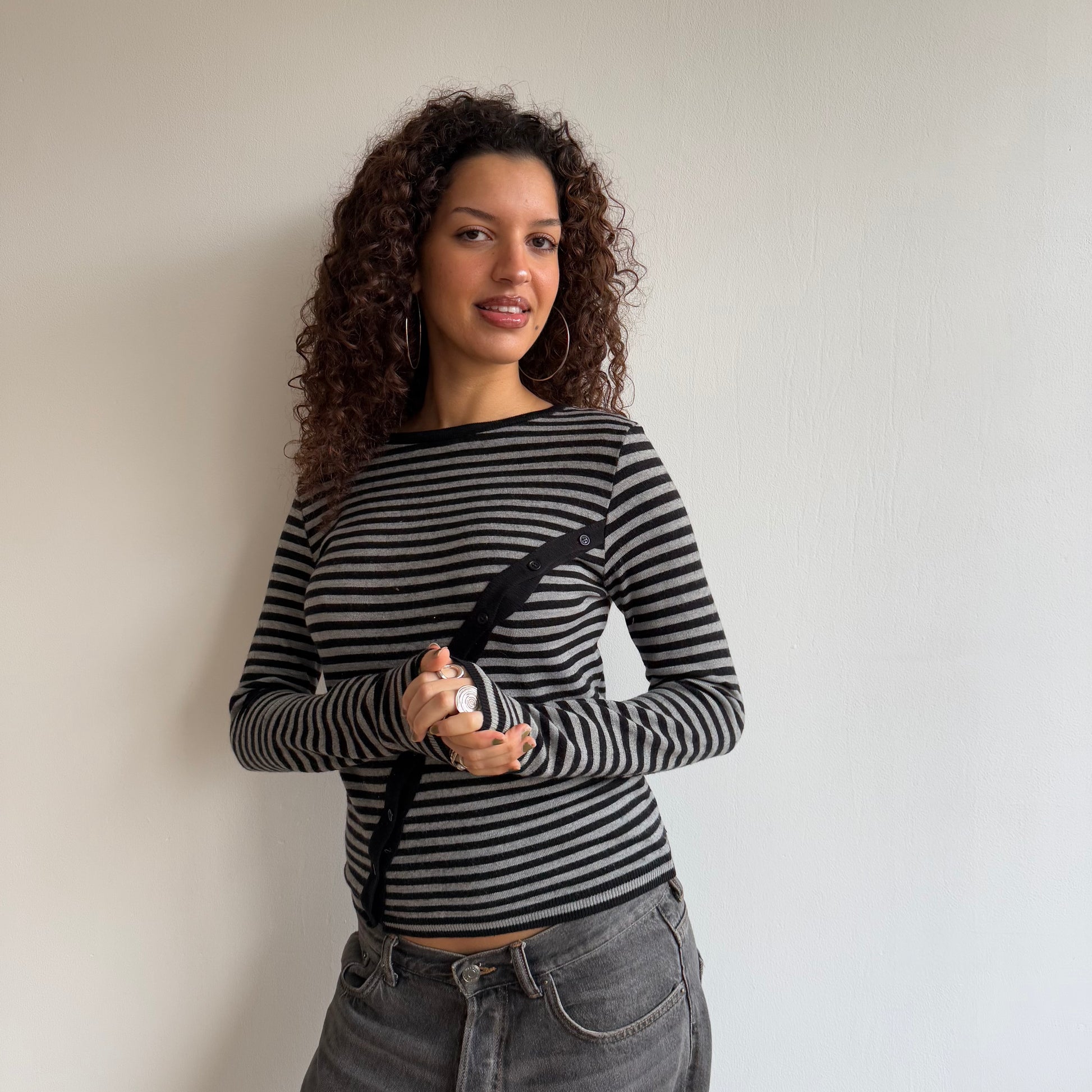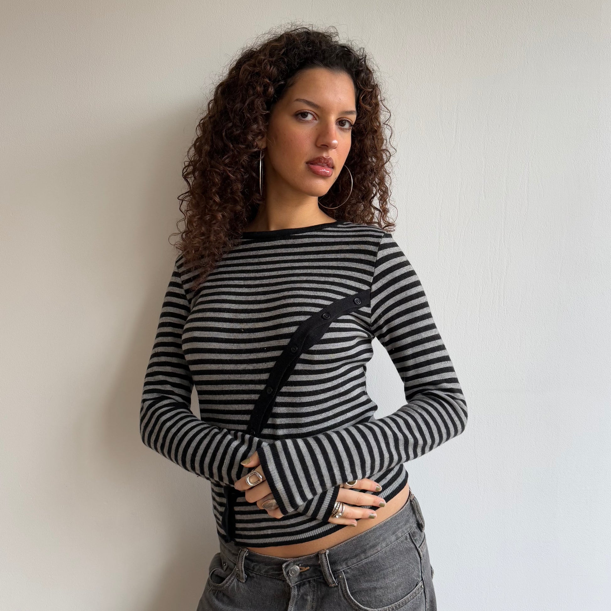 Black and grey striped slouchy knit with asymmetric button up front. Wool blend
