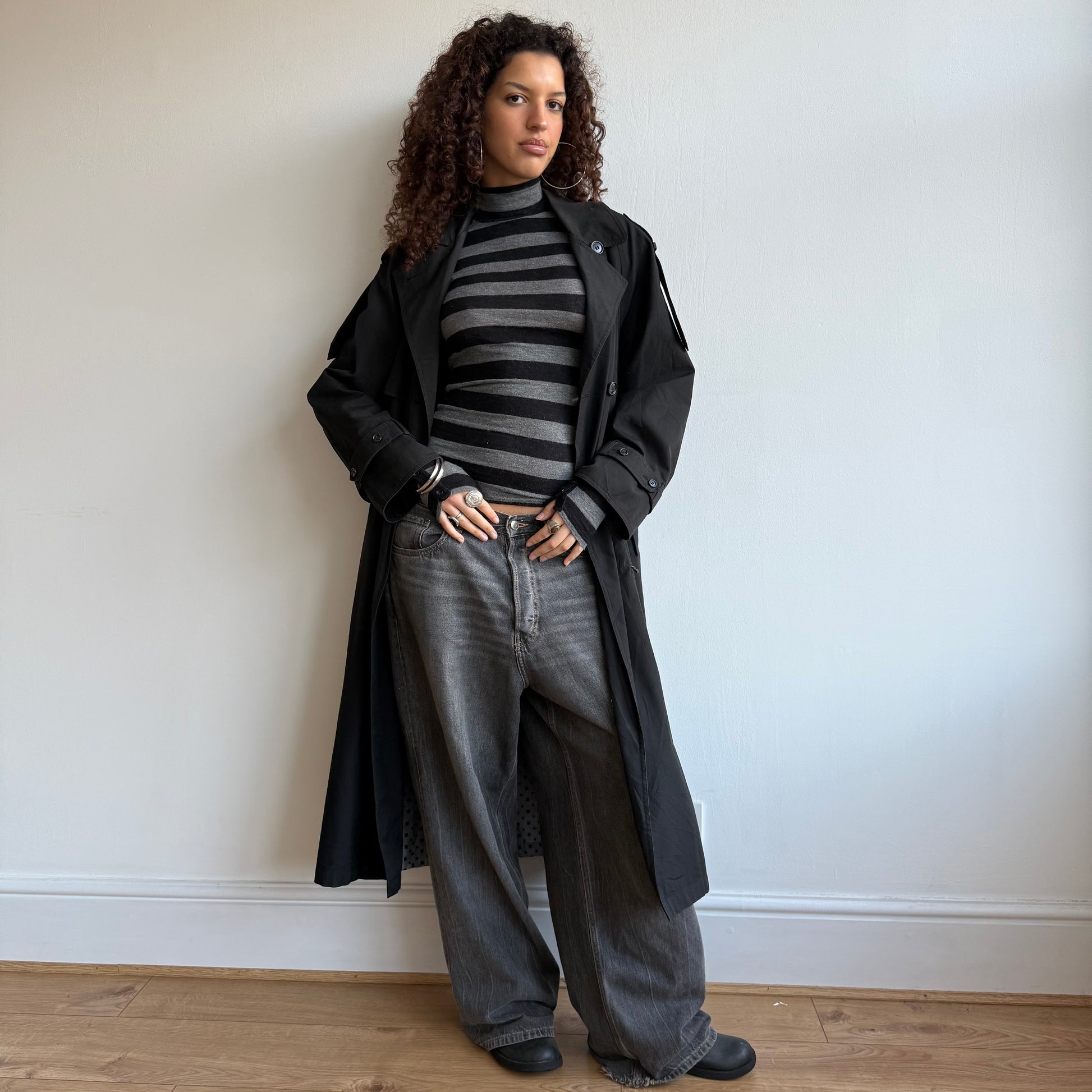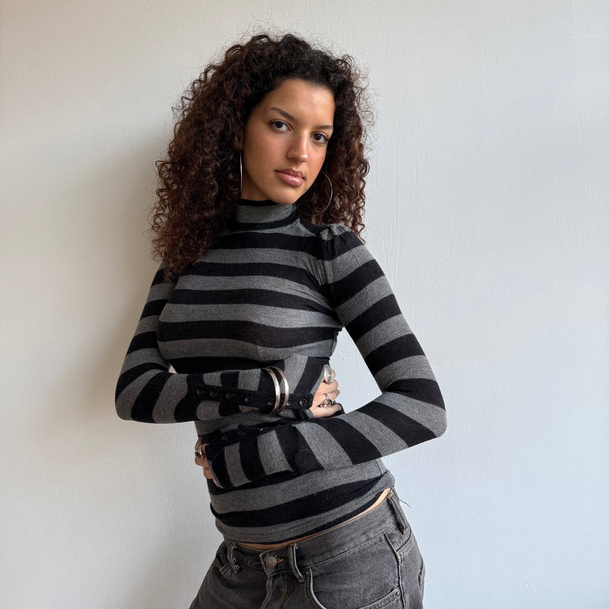Grey and black striped roll neck with button sleeves. Super soft stretchy material