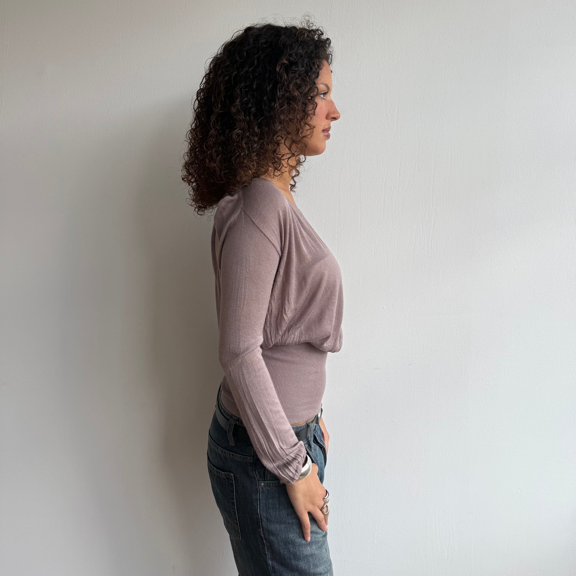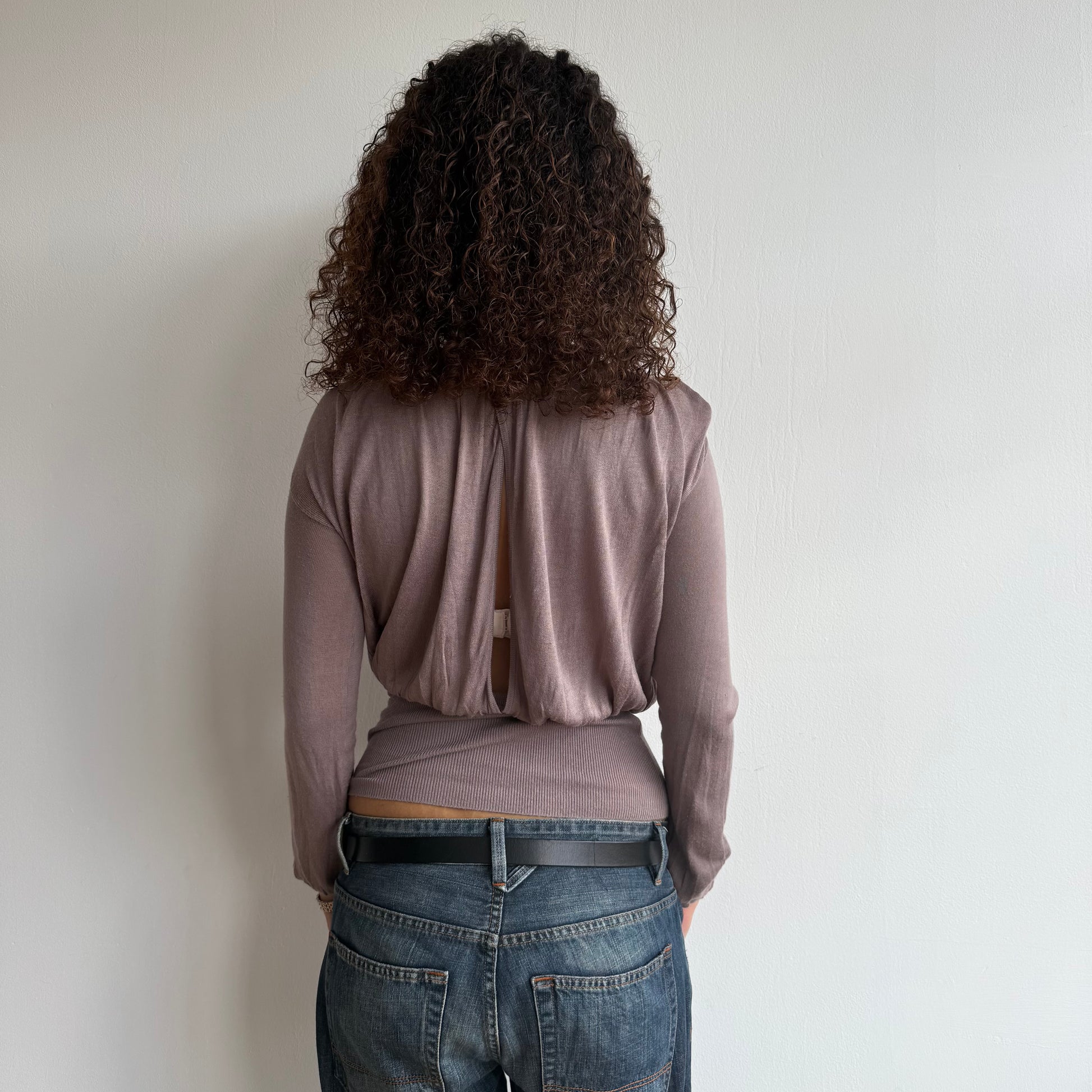 Super soft and flattering taupe knit with batwing sleeves and cinched waist. Keyhole back