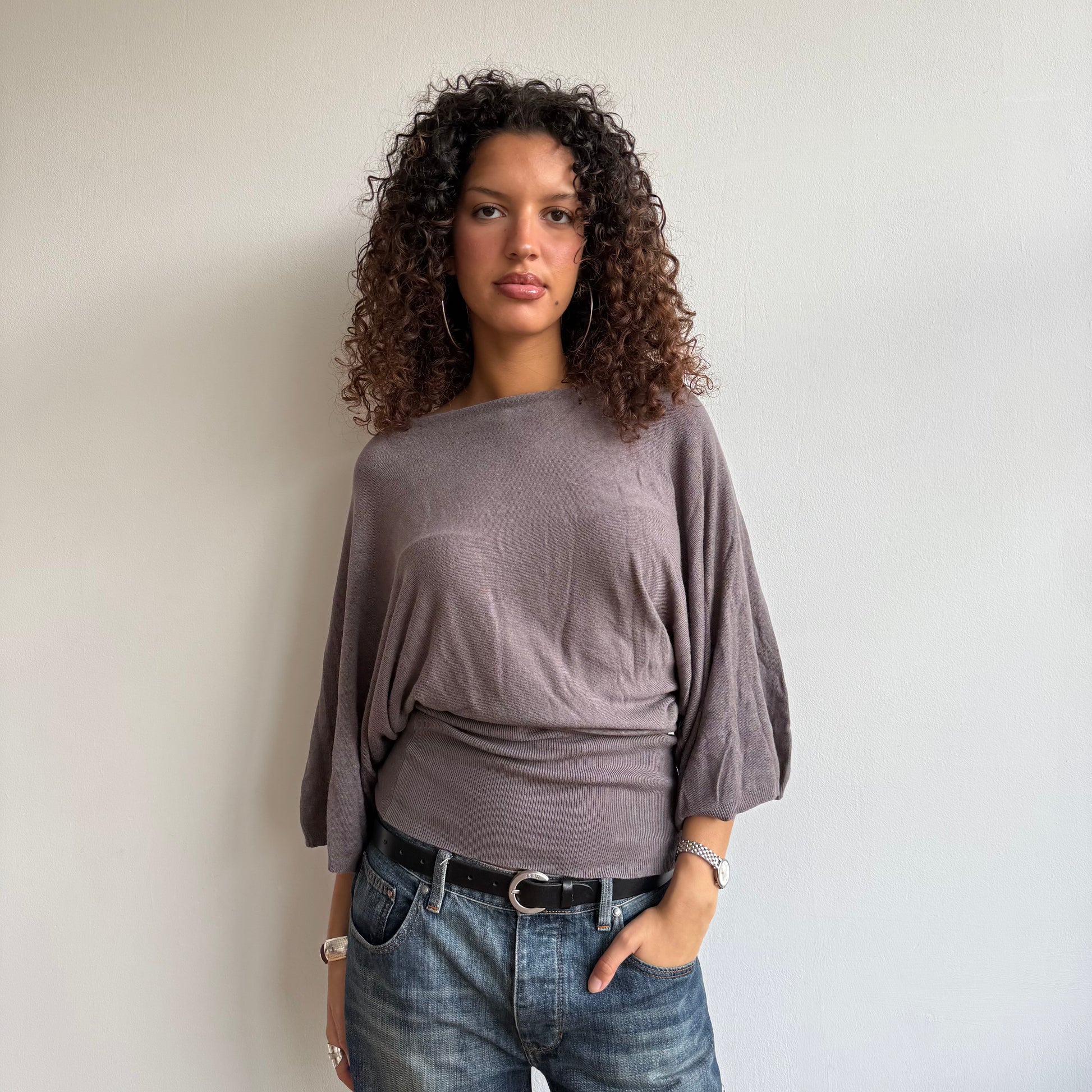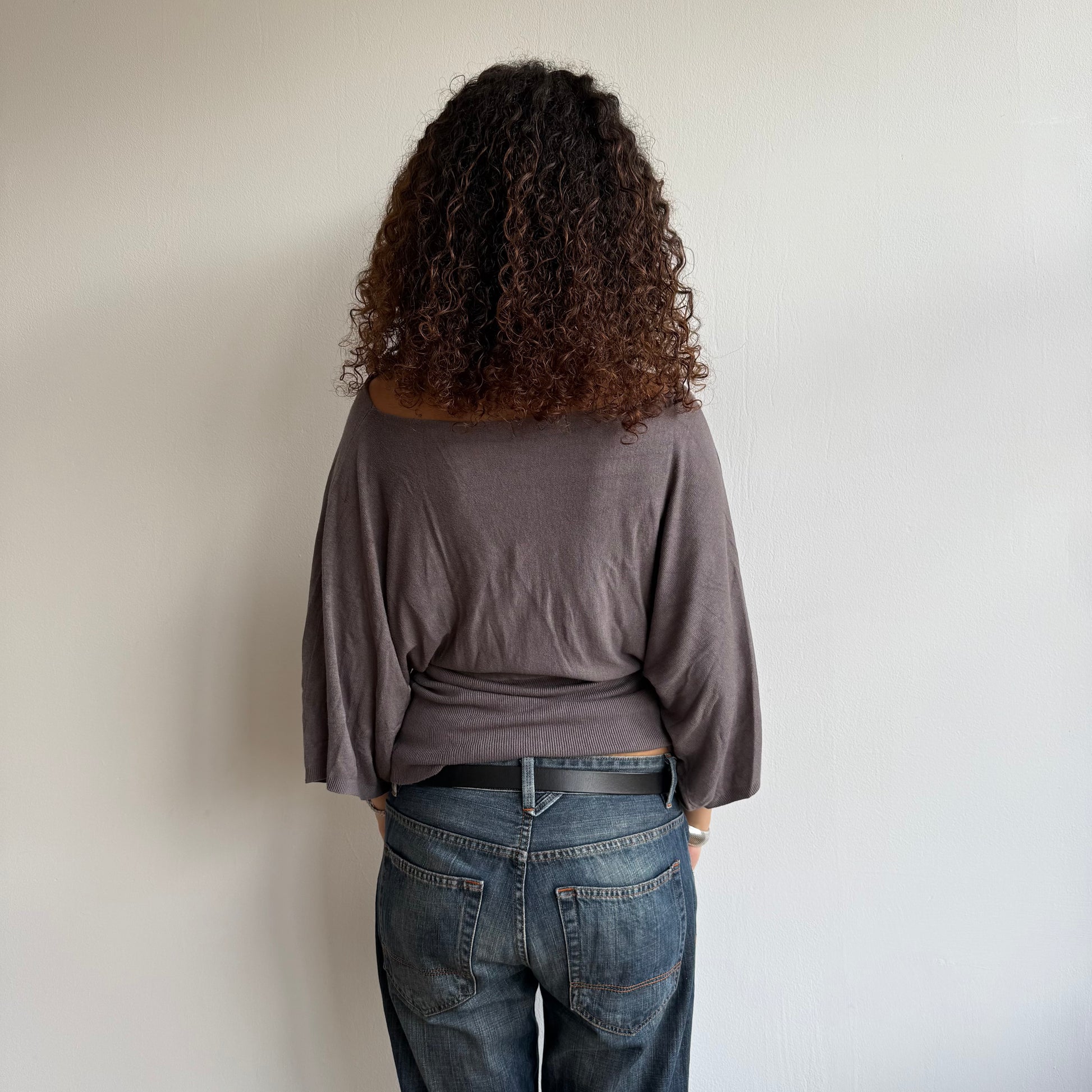Slouchy taupe short sleeve knit with pocket and buttons on the waist