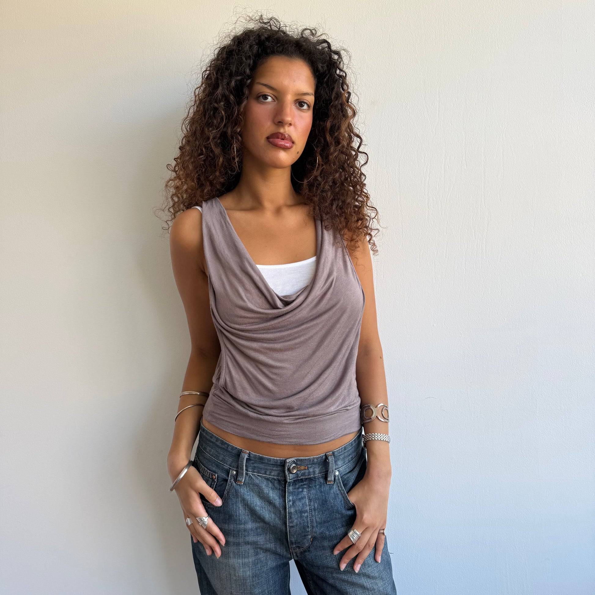 Taupe + White double layer top with cowl neck and tie keyhole back