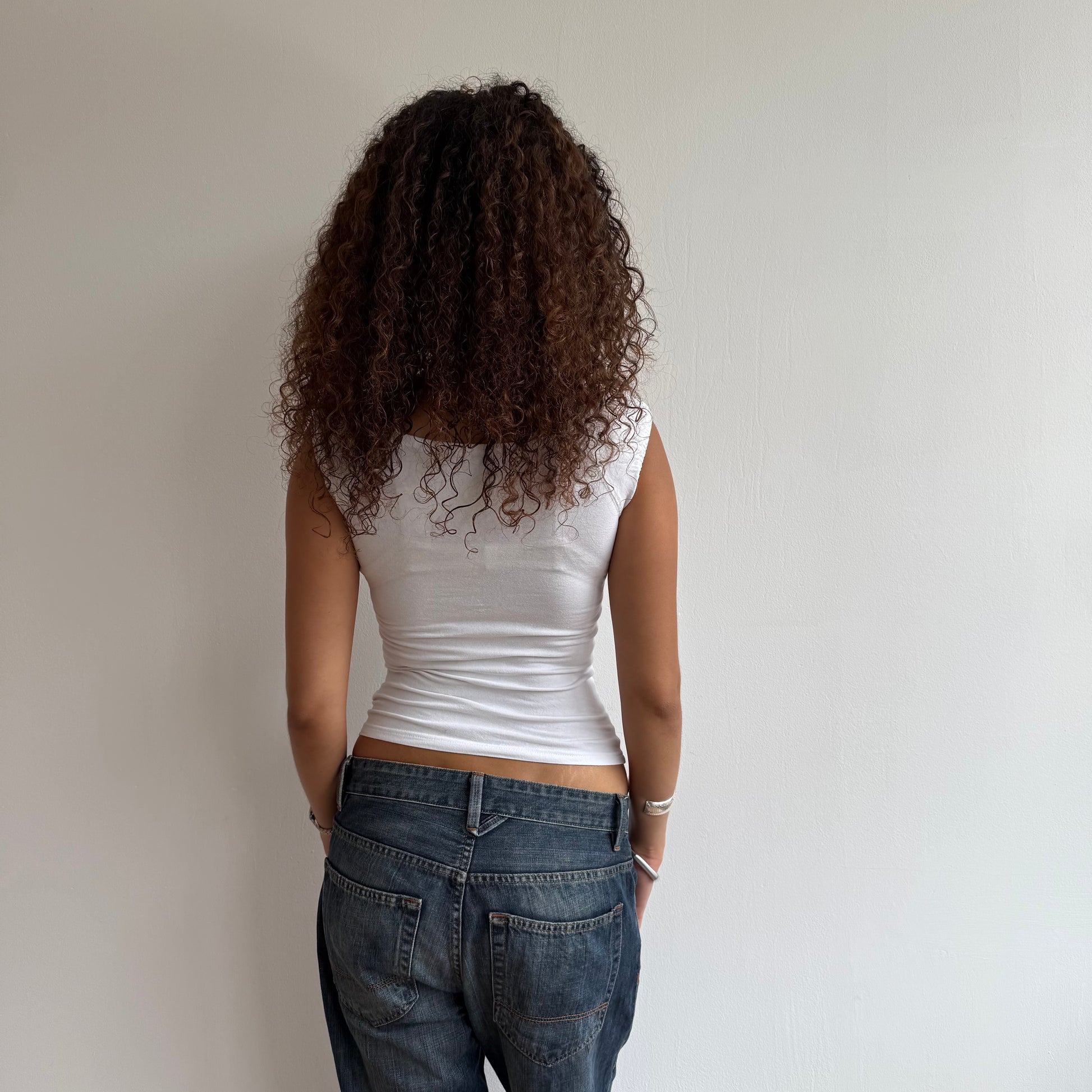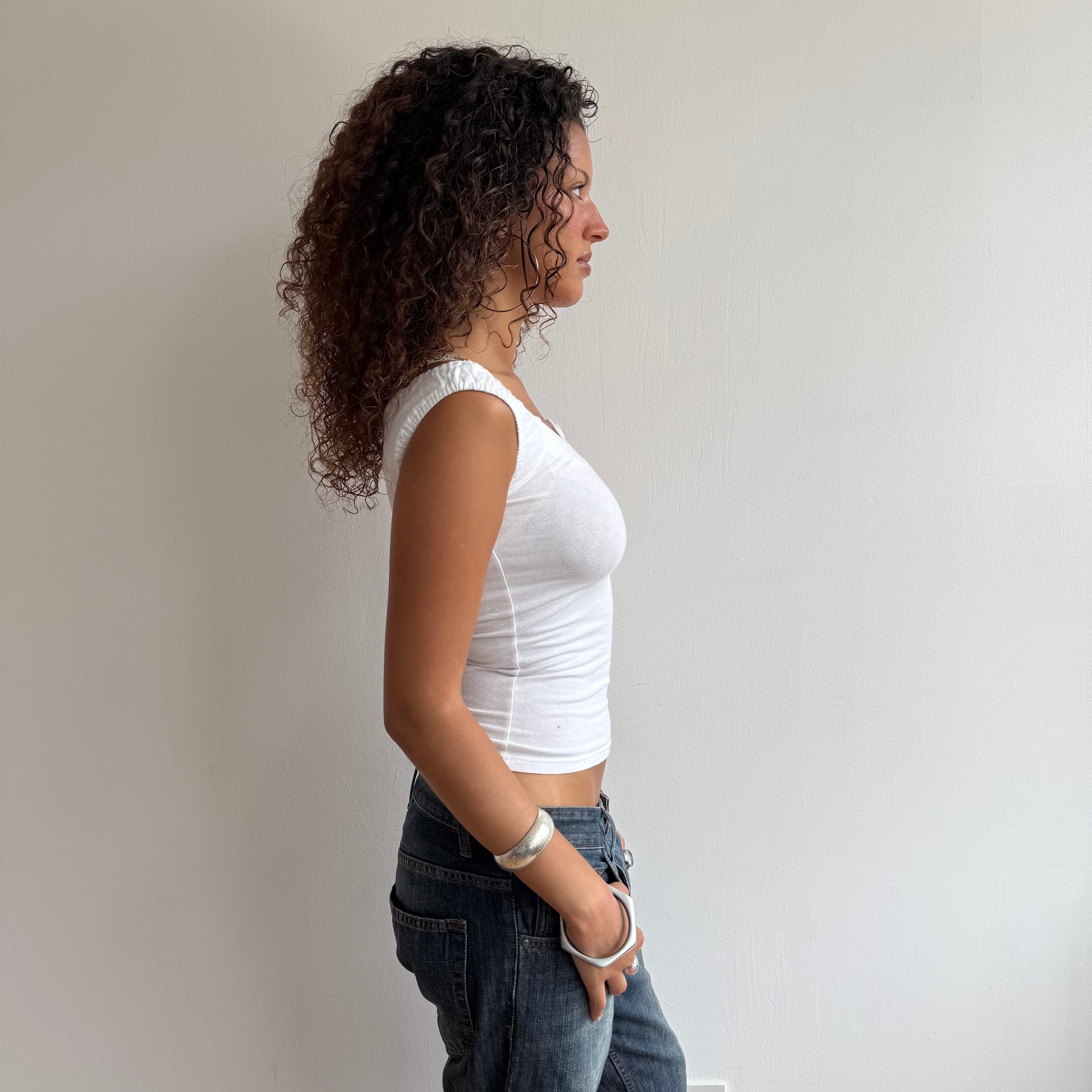 white top with button on the neckline
