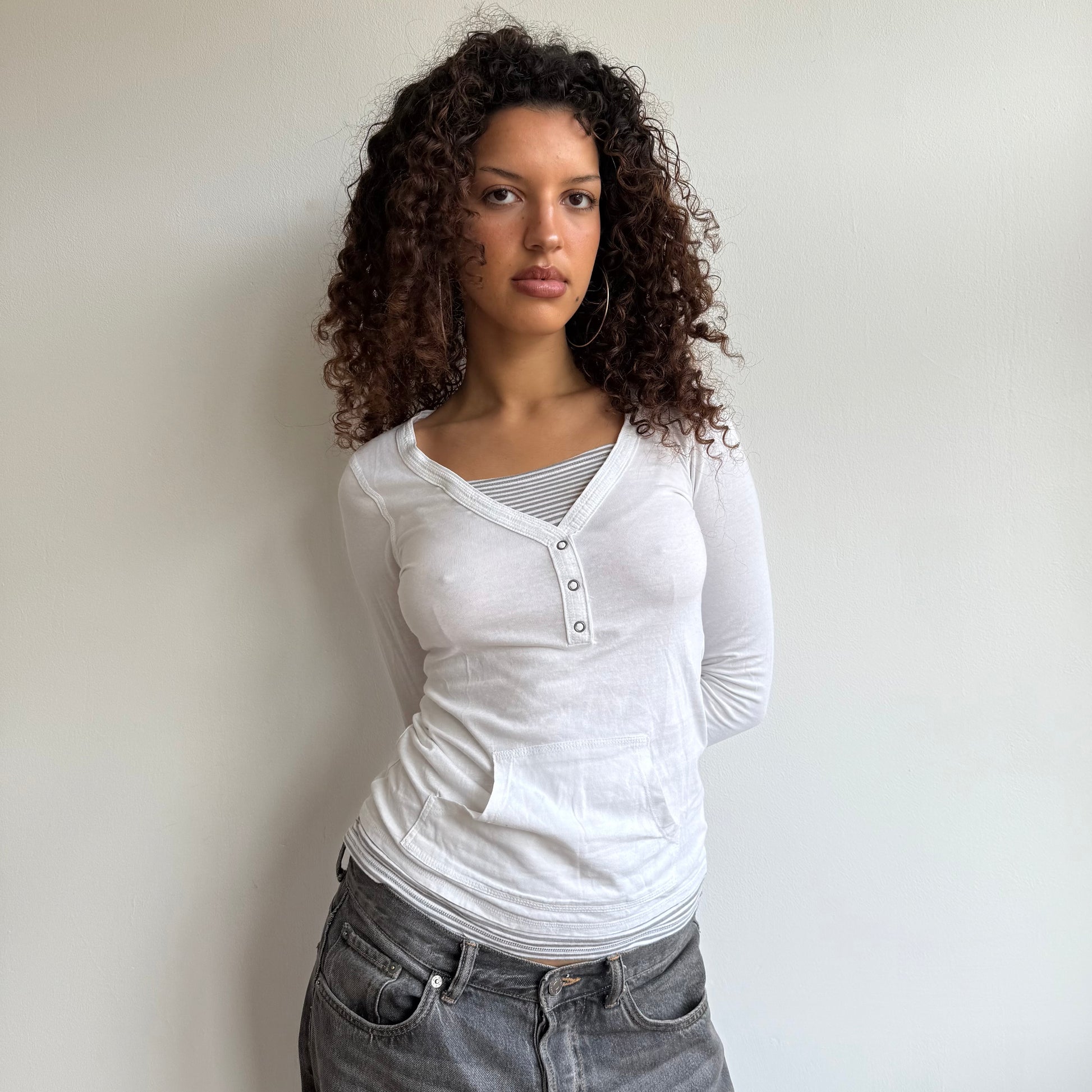 White long sleeve top with grey striped underlayer and popper neck line detail. Pocket on the front