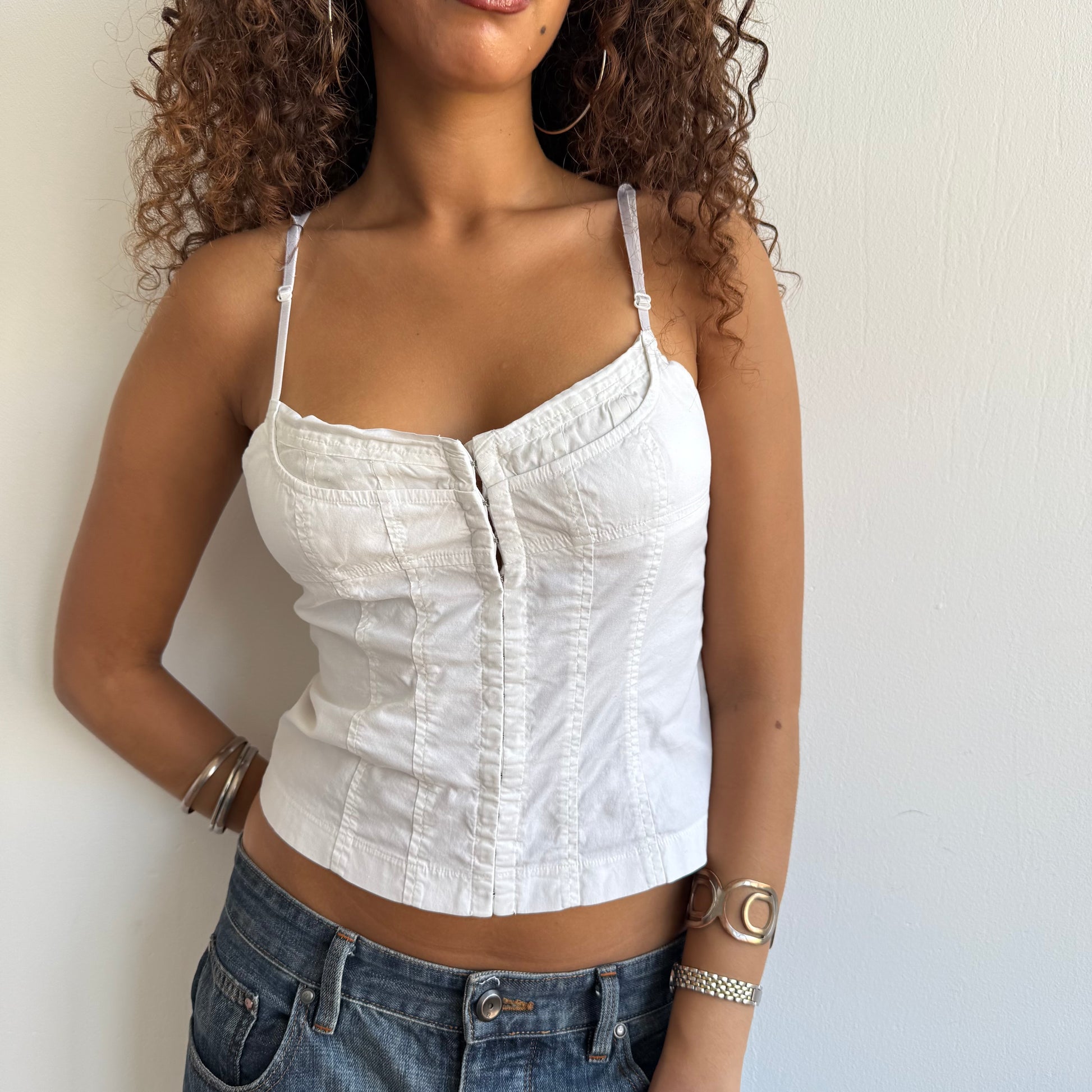 White hook eye milkmaid top with adjustable straps