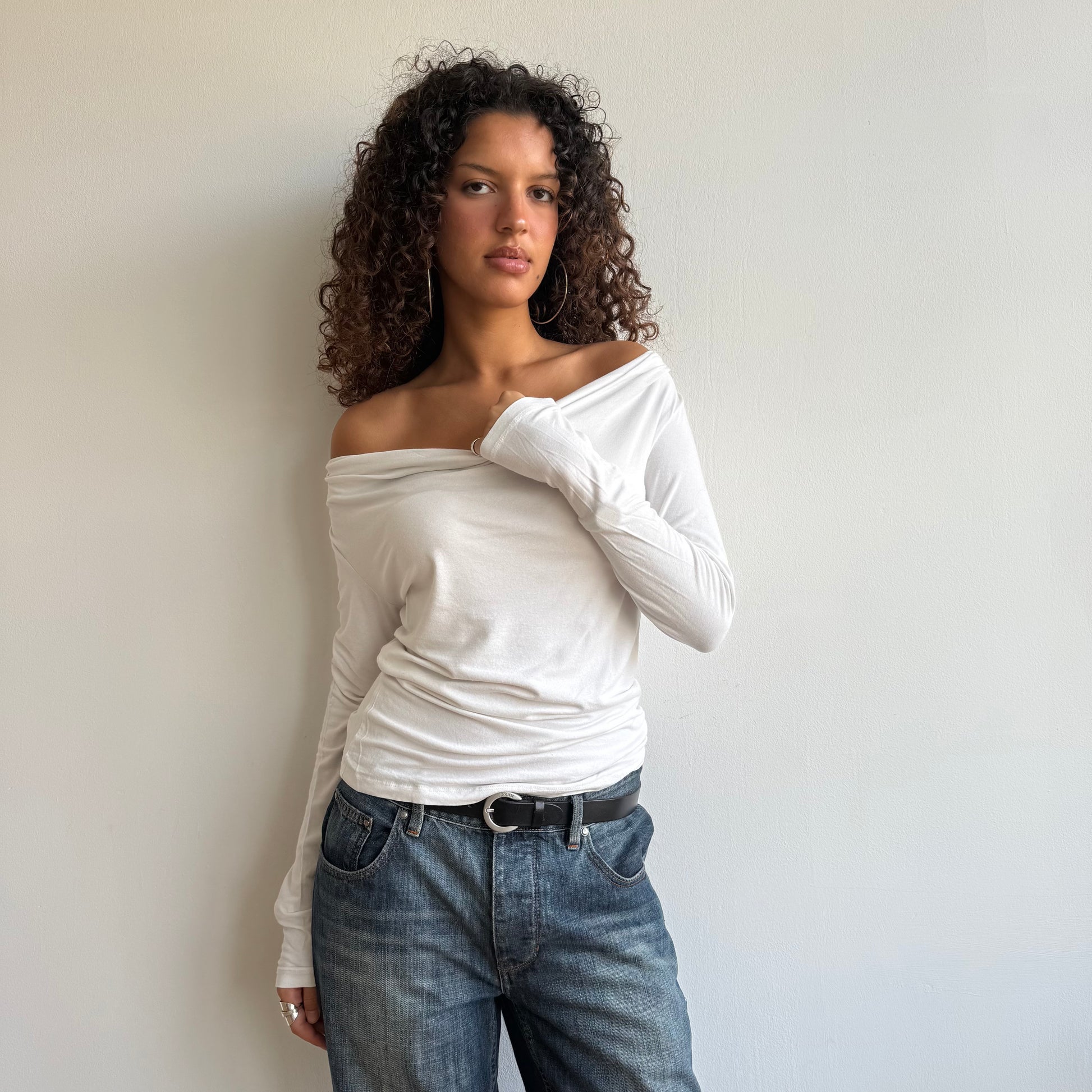 White thick material slouchy cowl neck long sleeve top can be worn several ways